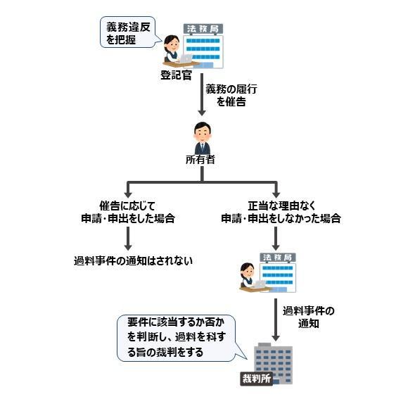 上記の期限までに、正当な理由なく住所等変更登記の手続きをしない場合は、以下の段階を踏んだうえで最終的に5万円以下の過料が課せられる可能性があります。