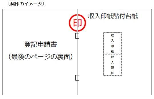 収入印紙は別紙に貼り付け、登録申請書とあわせてホチキスでとめて、申請者と収入印紙貼付台紙の間に押印しましょう。